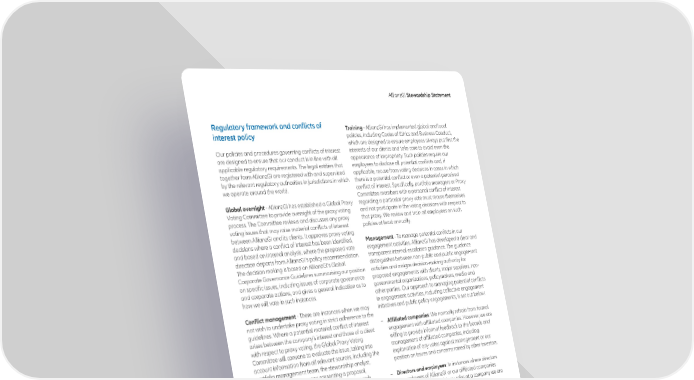 AllianzGI Stewardship Statement Regulatory framework and conflicts of Training - AllianzGI has implemented global and local interest policy policies, including Codes of Ethics and Business Conduct, which are designed to ensure employees always put first the Our policies and procedures governing conflicts of interest interests of our clients and take care to avoid even the are designed to ensure that our conduct is in line with all appearance of impropriety. Such policies require our applicable regulatory requirements. The legal entities that employees to disclose all potential conflicts and, if together form AllianzGI are registered with and supervised applicable, recuse from voting decisions in cases in which by the relevant regulatory authorities in jurisdictions in which there is a potential conflict or even a potential perceived we operate around the world. conflict of interest. Specifically, portfolio managers or Proxy Committee members with a personal conflict of interest Global oversight - AllianzGI has established a Global Proxy regarding a particular proxy vote must recuse themselves Voting Committee to provide oversight of the proxy voting and not participate in the voting decisions with respect to process. The Committee reviews and discusses any proxy that proxy. We review and train all employees on such voting issues that may raise material conflicts of interest policies at least annually. between AllianzGI and its clients. It approves proxy voting decisions where a conflict of interest has been identified, Management - To manage potential conflicts in our and based on internal analysis, where the proposed vote engagement activities, AllianzGI has developed a clear and direction departs from AllianzGI’s policy recommendation. transparent internal escalation guidance. The guidance The decision making is based on AllianzGI’s Global distinguishes between non-public and public engagement Corporate Governance Guidelines summarising our position activities and assigns decision-making authority for on specific issues, including issues of corporate governance proposed engagements with clients, major suppliers, non- and corporate actions, and gives a general indication as to governmental organizations, policymakers, media and how we will vote in such instances. other parties. Our approach to managing potential conflicts in engagement activities, including collective engagement Conflict management - There are instances when we may initiatives and public policy engagements, is set out below: not wish to undertake proxy voting in strict adherence to the guidelines. Where a potential material conflict of interest – Affiliated companies: We normally refrain from formal arises between the company’s interest and those of a client engagement with affiliated companies. However, we are with respect to proxy voting, the Global Proxy Voting willing to provide informal feedback to the boards and Committee will convene to evaluate the issue, taking into management of affiliated companies, including account information from all relevant sources, including the explanation of any votes against management or our portfolio management team, the stewardship analyst, position on issues and concerns raised by other investors. management of a company presenting a proposal, shareholder groups and independent proxy research – Directors and employees: In instances where directors services. or employees of AllianzGI or our affiliated companies hold directorships or advisory roles at a company we are Other potential conflicts of interest in voting clients’ proxies engaging, those persons will be excluded from are addressed through the application of the Global engagement or voting. Corporate Governance Guidelines and Proxy Voting Policy, which is implemented through an unaffiliated third-party – Clients and significant suppliers: We do not change proxy voting service provider. our general approach to engagement with clients and significant suppliers. All deviations from the guidelines are documented and reviewed by our Compliance function to ensure AllianzGI employees comply fully with relevant policies and procedures. Functional separation - A separation of processes and management within AllianzGI helps ensure that individuals who are clients or have business relationships with the firm are not able to exercise improper influence over our proxy voting decisions. Proxy voting rests entirely with the investment platform. We have robust policies and procedures in place designed to ensure that our investment professionals’ proxy voting decisions are not subject to improper influence and that individuals who work in client service, sales and marketing or other non-investment functions are not in a position to influence the voting process. 7