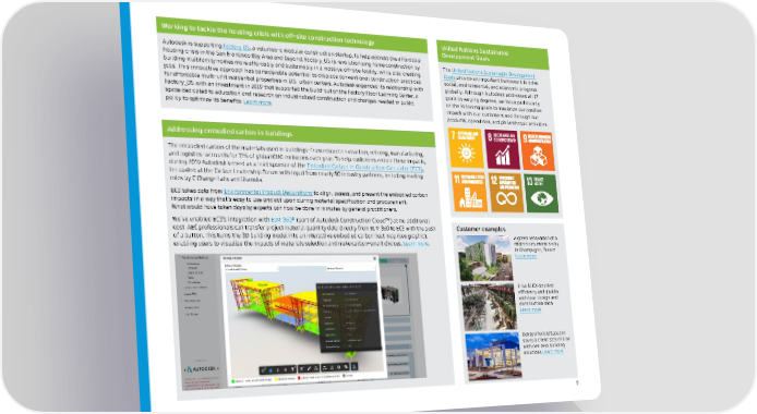 5 United Nations Sustainable Development Goals The United Nations Sustainable Development Goals provide an important framework to drive social, environmental, and economic progress globally. Although Autodesk addresses all 17 goals to varying degrees, we focus particularly on the following goals to maximize our positive impact with our customers and through our products, operations, and philanthropic activities. Working to tackle the housing crisis with off-site construction technology Autodesk is supporting Factory OS , a volumetric modular construction startup, to help address the affordable housing crisis in the San Francisco Bay Area and beyond. Factory_OS is revolutionizing home construction by building multifamily homes more affordably and sustainably in a massive off-site facility, while also creating jobs. This innovative approach has considerable potential to displace conventional construction practices for affordable multi-unit residential properties in U.S. urban centers. Autodesk expanded its relationship with Factory_OS with an investment in 2019 that supported the build-out of the Factory Floor Learning Center, a space dedicated to education and research on industrialized construction and changes needed in public policy to optimize its benefits. Learn more . Addressing embodied carbon in buildings The embodied carbon of the materials used in buildings—from resource extraction, refining, manufacturing, and logistics—accounts for 11% of global GHG emissions each year. To help customers reduce these impacts, during 2019 Autodesk served as a lead sponsor of the Embodied Carbon in Construction Calculator (EC3) , incubated at the Carbon Leadership Forum with input from nearly 50 industry partners, including leading roles by C Change Labs and Skanska. EC3 takes data from Environmental Product Declarations to align, assess, and present the embodied carbon impacts in a way that’s easy to use and act upon during material specification and procurement. What would have taken days by experts can now be done in minutes by general practitioners. We’ve enabled EC3’s integration with BIM 360 ® (part of Autodesk Construction Cloud™) at no additional cost. AEC professionals can transfer project material quantity data directly from BIM 360 to EC3 with the push of a button. This turns the 3D building model into an interactive embodied carbon heat map (see graphic), enabling users to visualize the impacts of materials selection and make carbon-smart choices. Learn more . Customer examples A green renovation of a midcentury monstrosity in Champagne, France Learn more How BLOX doubled efficiency and quality with lean design and construction data Learn more Dekker/Perich/Sabatini saves a client $2.5 million with net-zero building solutions Learn more
