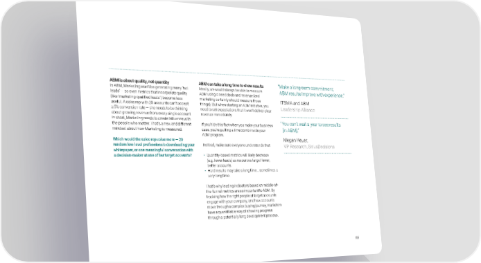 ABM is about quality, not quantity ABM can take a long time to show results “ Make a long-term commitment; In ABM, Marketing won’t be generating many ‘hot Ideally, we would always be able to measure ABM results improve with experience.” leads’ — so even metrics that incorporate quality ABM using closed deals and revenue (and (like ‘marketing qualified leads’) become less marketing certainly should measure those ITSMA and ABM useful. A sales rep with 20 accounts can’t accept things). But when starting an ABM initiative, you Leadership Alliance a 5% conversion rate — she needs to be thinking need to set expectations that it won’t deliver clear about growing revenue from every single account. revenue immediately. In short, Marketing needs to create influence with “ You can’t wait a year to see results the people who matter. That’s a new and different If you hide this fact when you make your business mindset about how Marketing is measured. case, you’re putting a time bomb inside your [in ABM].” ABM program. Which would the sales rep value more — 20 Megan Heuer, random low-level professionals downloading your Instead, make sure everyone understands that: VP Research, SiriusDecisions whitepaper, or one meaningful conversation with a decision-maker at one of her target accounts? • Quantity-based metrics will likely decrease (e.g. fewer leads) as resources target fewer, better accounts. • Hard results may take a long time… sometimes a very long time. That’s why leading indicators based on middle-of- the-funnel metrics are so important to ABM. By tracking how the right people at target accounts engage with your company, and how accounts move through a complex buying journey, marketers have a quantifiable way of showing progress through a potentially long development process. 106