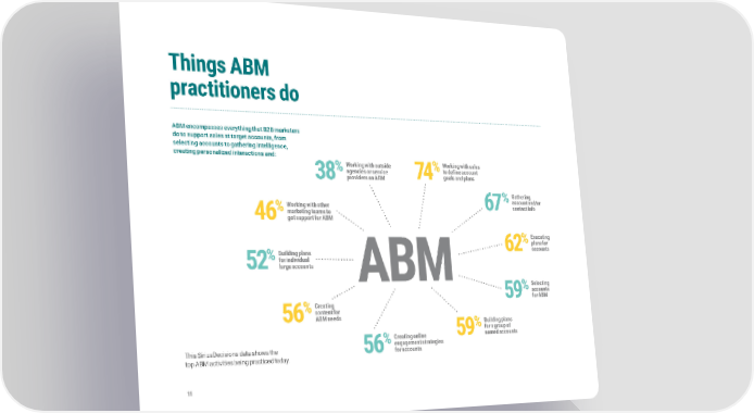 Things ABM practitioners do ABM encompasses everything that B2B marketers do to support sales at target accounts, from selecting accounts to gathering intelligence, creating personalized interactions and: Working with sales %Working with outside %to define account agencies or service 74 goals and plans 38 providers on ABM %Gathering Working with other account and/or %marketing teams to 67 contact info 46 get support for ABM %Executing plans for %Building plans 62 accounts for individual 52 large accounts ABM %Selecting accounts %Creating 59 for ABM content for 56 ABM needs %Building plans for a group of %Creating online 59 named accounts This SiriusDecisions data shows the engagement strategies top ABM activities being practiced today. 56 for accounts 11