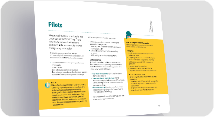 : s M s B e Ac g c inu t s n o e d t m a e o t Vl r r p e a h Pilots P Imt We get it: all the best practices in this We’ve seen pilots structured in many ways: guide can be overwhelming. That’s • One sales rep and one marketer targeting five ABM in Enterprise vs SMB Companies why many companies that have accounts (Strategic ABM) ABM looks different in larger enterprises than deployed ABM successfully started • Three reps and a marketer targeting one industry small- and mid-sized companies. their journey with a pilot. sector (Scale ABM) Enterprise • A full ABM commitment but in one territory • Significant focus on post-sale expansion as By playing a long game, pilots help you or region well as new logos incrementally build momentum and support for • A full ABM program for one product line • Likely they already have field marketing teams broader rollout of ABM. The benefits are clear: Get started fast in place, some level of experience reaching • Learn how ABM works for your specific kinds Making the transition to ABM can be especially out to target accounts, QBR processes in of accounts hard when you need to grow pipeline and revenue place, etc. • Lower the risk RIGHT NOW. Here are some things you can do to • Can invest in ABM specialists • Iron out any issues before you scale show some benefit right away: • Sales and marketing alignment is harder, • Earn stronger executive and stakeholder support especially when teams work in remote locations • Lessen the change-management challenge • Map leads to accounts: L2A is the foundation Small- and Medium-Sized of any ABM initiative • More likely to focus primarily on new-business • Launch a simple, integrated play: TOPO acquisition Pro tip recommends a play that combines SDR outreach • More likely that ABM is an entirely new muscle Pilots often begin with simple Lead-to-Account with marketing ‘air-cover’ such as direct mail to • More likely they need to use existing staff to Matching, especially at large enterprises. One generate meetings work on ABM global software company succeeded by • Account scoring: Show the sales team which • Alignment is not easy but at least teams are starting with L2A technology for just five sales accounts are engaging so they know where to more likely to work in the same location reps, then expanded to 30, and beyond. They invest their time and energy worked through technical barriers, got the IT You can see benefit in as little as one quarter with department on board, and created some quick an aggressive approach like this. wins. The sales reps’ enthusiasm supported the broader rollout. 146
