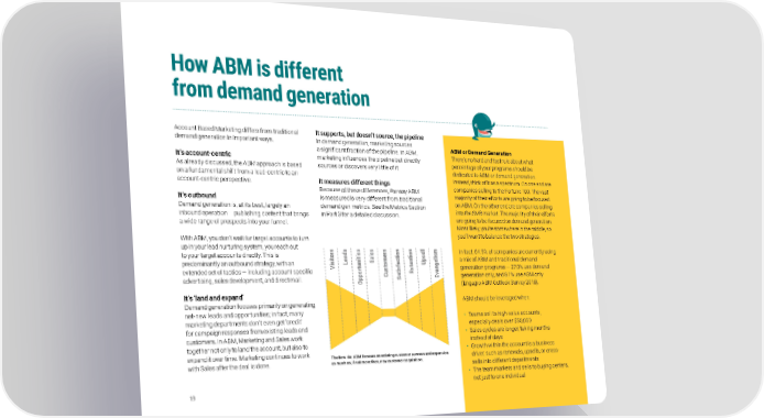 How ABM is different from demand generation Account Based Marketing differs from traditional It supports, but doesn’t source, the pipeline demand generation in important ways. In demand generation, marketing sources ABM or Demand Generation a significant fraction of the pipeline. In ABM, There’s no hard and fast rule about what It’s account-centric marketing influences the pipeline but directly percentage of your programs should be As already discussed, the ABM approach is based sources or discovers very little of it. dedicated to ABM or demand generation. on a fundamental shift from a lead-centric to an Instead, think of it as a spectrum. On one end are account-centric perspective. It measures different things companies selling to the Fortune 100. The vast Because of these differences, the way ABM majority of their efforts are going to be focused It’s outbound is measured is very different from traditional on ABM. On the other end are companies selling Demand generation is, at its best, largely an demand gen metrics. See the Metrics Section into the SMB market. The majority of their efforts inbound operation — publishing content that brings in Part 3 for a detailed discussion. are going to be focused on demand generation. a wide range of prospects into your funnel. Most likely, you’re somewhere in the middle, so With ABM, you don’t wait for target accounts to turn you’ll want to balance the two strategies. up in your lead nurturing system, you reach out s s s s n n ll m In fact, 64.9% of companies are currently using to your target accounts directly. This is r d e les r io io o a e t t se t e iti a m c n p lis a mix of ABM and traditional demand predominantly an outbound strategy, with an isi L n S o U e V tu t fa te g r s s e n generation programs — 27.0% use demand extended set of tactics — including account-specific i a o t R v p Cu a E generation only, and 8.1% use ABM only advertising, sales development, and direct mail. p S O (Engagio ABM Outlook Survey 2018). It’s ‘land and expand’ ABM should be leveraged when: Demand generation focuses primarily on generating net-new leads and opportunities; in fact, many • Teams sell to high-value accounts, marketing departments don’t even get ‘credit’ especially deals over $50,000 for campaign responses from existing leads and • Sales cycles are longer, taking months customers. In ABM, Marketing and Sales work instead of days together not only to land the account, but also to • Growth within the account is a business expand it over time. Marketing continues to work The Bow-tie: ABM focuses on existing customer success and expansion driver, such as renewals, upsells, or cross- with Sales after the deal is done. as much as, if not more than, new customer acquisition. sells into different departments • The team markets and sells to buying centers, not just to one individual 19