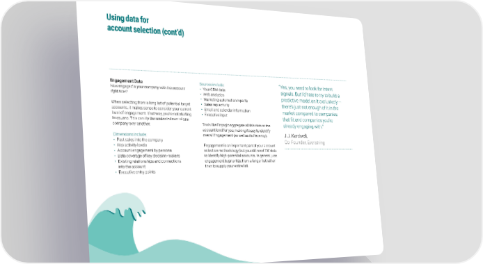Using data for account selection (cont’d) Engagement Data Sources include: “ Yes, you need to look for intent How engaged is your company with this account • Your CRM data signals. But I’d hate to try to build a right now? • Web analytics predictive model on it exclusively — • Marketing automation reports When selecting from a long list of potential target • Sales rep activity there’s just not enough of it in the accounts, it makes sense to consider your current • Email and calendar information market compared to companies level of engagement. That way, you’re not starting • Executive input that fit and companies you’re from zero. This can tip the scales in favor of one company over another. Tools like Engagio aggregate all this data at the already engaging with.” account level for you, making it easy to identify Dimensions include: overall Engagement (as well as its Recency). J.J. Kardwell, • Past sales into the company Co-Founder, Everstring • Rep activity levels Engagement is an important part of your account • Account engagement by persona selection methodology, but you still need ‘Fit’ data • Data coverage of key decision-makers to identify high-potential accounts. In general, use • Existing relationships and connections engagement to prioritize from a longer list rather into the account than to supply your entire list. • Executive entry points