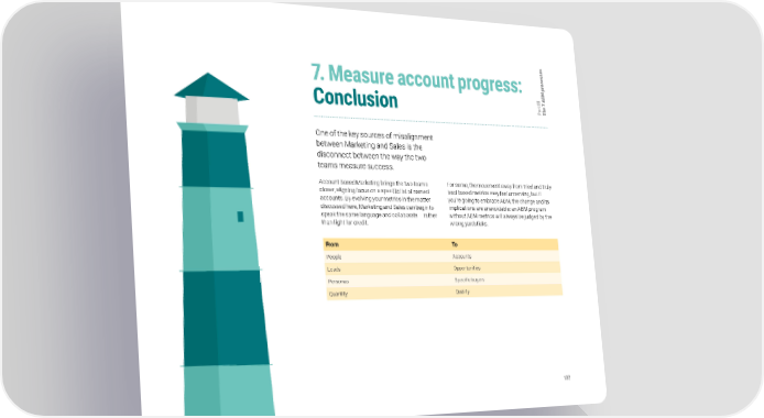 s e s s e c o 7. Measure account progress: r M p B III 7 A t e r a h Conclusion P T One of the key sources of misalignment between Marketing and Sales is the disconnect between the way the two teams measure success. Account Based Marketing brings the two teams For some, the movement away from tried and truly closer, aligning focus on a specific list of named lead-based metrics may feel unnerving, but if accounts. By evolving your metrics in the matter you’re going to embrace ABM, the change and its discussed here, Marketing and Sales can begin to implications are unavoidable: an ABM program speak the same language and collaborate — rather without ABM metrics will always be judged by the than fight for credit. wrong yardsticks. From To People Accounts Leads Opportunities Personas Specific buyers Quantity Quality 132