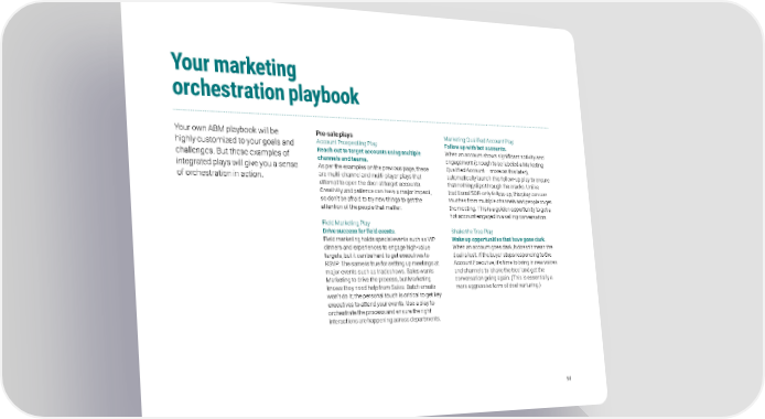 Your marketing orchestration playbook Your own ABM playbook will be Pre-sale plays Marketing Qualified Account Play highly customized to your goals and Account Prospecting Play Follow up with hot accounts. challenges. But these examples of Reach out to target accounts using multiple When an account shows significant activity and channels and teams. engagement (enough to be labeled a Marketing integrated plays will give you a sense As per the examples on the previous page, these Qualified Account — more on this later), of orchestration in action. are multi-channel and multi-player plays that automatically launch this follow-up play to ensure attempt to open the door at target accounts. that nothing slips through the cracks. Unlike Creativity and patience can have a major impact, traditional SDR-only follow-up, this play can use so don’t be afraid to try new things to get the touches from multiple channels and people to get attention of the people that matter. the meeting. This is a golden opportunity to get a hot account engaged in a selling conversation. Field Marketing Play Drive success for field events. Shake the Tree Play Field marketing holds special events such as VIP Wake up opportunities that have gone dark. dinners and experiences to engage high-value When an account goes dark, it doesn’t mean the targets, but it can be hard to get executives to deal is lost. If the buyer stops responding to the RSVP. The same is true for setting up meetings at Account Executive, it’s time to bring in new voices major events such as tradeshows. Sales wants and channels to ‘shake the tree’ and get the Marketing to drive the process, but Marketing conversation going again. (This is essentially a knows they need help from Sales. Batch emails more aggressive form of deal nurturing.) won’t do it; the personal touch is critical to get key executives to attend your events. Use a play to orchestrate the process and ensure the right interactions are happening across departments. 94