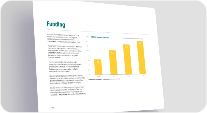 Funding Account Based Marketing is a marathon. That 4 ABM Performance Over Time 1 = Needs Improvement, 3 = Meeting Objectives, 5 = Excelling means you need to get proper funding for a program that won’t deliver clear revenue 3.5 3.7 immediately — and possibly not for a long time. If you hide this fact when you make your business 3 3.3 case, you’re putting a time bomb inside your ABM program. Instead, make sure all executives 2.5 2.6 understand the timescales and metrics you’ll be using to ensure you’re making progress 2 towards revenue. 1.5 1.6 The companies who stay with their ABM strategies and track the right metrics invariably 1 show significant return on their investment. But success is not measured in weeks (or 0.5 even months in many cases). Marketing typically funds ABM programs initially, 0 and funding for technology typically comes from the Inception < 1yr 1yr - 2yr > 2yr general marketing budget (unless it is something Stick with your ABM program — results improve continuously over time. specifically for ABM such as account insight). By year three of an ABM program, however, many sales executives tend to be willing to fund the campaigns that benefit their most important accounts. They’ve seen the results and want more. 143
