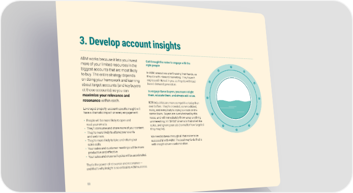 3. Develop account insights ABM works because it lets you invest Cut through the noise to engage with the more of your limited resources in the right people biggest accounts that are most likely In ABM, executives aren’t raising their hands, as to buy. The entire strategy depends they do with inbound marketing. They haven’t on doing your homework and learning expressed interest in you, as they do with lead- about target accounts (and key buyers based demand generation. at those accounts) so you can To engage these buyers, you must delight maximize your relevance and them, educate them, and always add value. resonance within each. B2B industries are more competitive today than Leveraged properly, account-specific insight will ever before. They’re crowded, commoditized, have a dramatic impact on every engagement: noisy, and everybody is trying to knock on the same doors. Buyers are overwhelmed by this • People will be more likely to open and noise, and will immediately throw away anything read your emails. uninteresting, hit ‘SPAM’ on emails that smell like • They’ll consume and share more of your content. sales, and ignore your ads (no matter how targeted • They’re more likely to attend your events they may be). and webinars. We need to break through all that noise to be • They’re more likely to take and return your successful with ABM. The best way to do that is sales calls. with insight-driven customization. • Your sales and customer meetings will be more productive and effective. • Your sales and cross-sell cycles will be accelerated. That’s the power of relevance and resonance — and that’s why insight is so critical to ABM success. 53