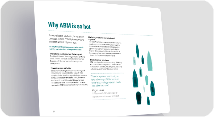 Why ABM is so hot Account Based Marketing is not a new Marketing and Sales are ready to work concept. In fact, ITSMA pioneered the together concept almost 15 years ago. The rise of marketing automation and lead nurturing have brought Sales and Marketing closer together So why has ABM suddenly generated so much than ever before. A more disciplined approach to activity and attention? A few good reasons: pipeline management has earned Marketing the respect of colleagues in Sales. And, new levels of The returns on inbound are flattening out transparency have made Marketing more aware of Traditional ‘inbound’ demand generation is hitting the real challenges the sales force faces. a wall. There’s too much content and it’s too hard The technology is in place to stand out. Companies need new engines to ABM has always been a viable strategy. But today, drive growth. the tools and technologies are in place to make The economics are better it much more scalable, including CRM, marketing Sales and marketing teams are discovering that automation, analytics and personalization. inbound is not very good at the biggest, most complex deals. Reaching high into larger accounts “ There is a greater opportunity to simply drives larger and better deals, those that tend to stick around longer and become more take advantage of ABM because valuable over time. As companies look to move today’s technology makes it much up-market, ABM becomes much more compelling. less labor intensive.” Megan Heuer, VP Research, SiriusDecisions in an interview with Demand Gen Report 21