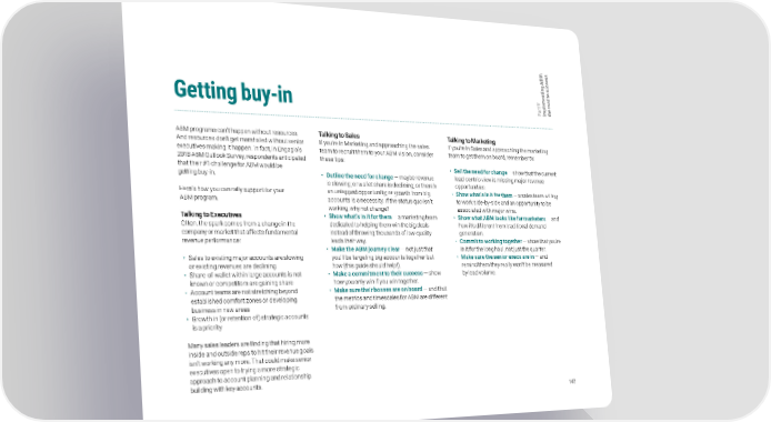 : s M s B e A c g c in u t s n o e d t m a e o t Vl r r p e a h Getting buy-in P Im t ABM programs can’t happen without resources. Talking to Sales Talking to Marketing And resources don’t get marshaled without senior If you’re in Marketing and approaching the sales If you’re in Sales and approaching the marketing executives making it happen. In fact, in Engagio’s team to recruit them to your ABM vision, consider team to get them on board, remember to: 2018 ABM Outlook Survey, respondents anticipated these tips: that their #1 challenge for ABM would be • Sell the need for change — show that the current getting buy-in. • Outline the need for change — maybe revenue lead-centric view is missing major revenue is slowing; or wallet share is declining; or there’s opportunities. Here’s how you can rally support for your an untapped opportunity; or growth from big • Show what’s in it for them — a sales team willing ABM program. accounts is a necessity. If the status quo isn’t to work side-by-side and an opportunity to be working, why not change? associated with major wins. Talking to Executives • Show what’s in it for them — a marketing team • Show what ABM looks like for marketers — and Often, the spark comes from a change in the dedicated to helping them win the big deals how it’s different from traditional demand company or market that affects fundamental instead of throwing thousands of low-quality generation. revenue performance: leads their way. • Commit to working together — show that you’re • Make the ABM journey clear — not just that in it for the long haul, not just the quarter. • Sales to existing major accounts are slowing you’ll be targeting big accounts together but • Make sure the senior execs are in — and or existing revenues are declining how (this guide should help!). remind them they really won’t be measured • Share-of-wallet within large accounts is not • Make a commitment to their success — show by lead volume. known or competitors are gaining share how you only win if you win together. • Account teams are not stretching beyond • Make sure their bosses are on board — and that established comfort zones or developing the metrics and timescales for ABM are different business in new areas from ordinary selling. • Growth in (or retention of) strategic accounts is a priority Many sales leaders are finding that hiring more inside and outside reps to hit their revenue goals isn’t working any more. That could make senior executives open to trying a more strategic approach to account planning and relationship building with key accounts. 142