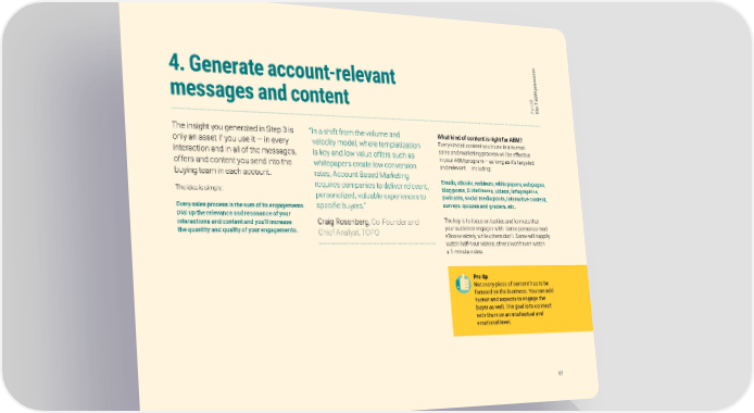 s e s s e c o 4. Generate account-relevant r M p B III 7 A t e r a h messages and content P T The insight you generated in Step 3 is “I n a shift from the volume and What kind of content is right for ABM? only an asset if you use it — in every velocity model, where templatization Every kind of content you’d use in a normal interaction and in all of the messages, is key and low value offers such as sales and marketing process will be effective offers and content you send into the whitepapers create low conversion in your ABM program — as long as it’s targeted and relevant — including: buying team in each account. rates, Account Based Marketing Emails, eBooks, webinars, white papers, web pages, The idea is simple: requires companies to deliver relevant, blog posts, SlideShares, videos, infographics, personalized, valuable experiences to podcasts, social media posts, interactive content, Every sales process is the sum of its engagements. specific buyers.” surveys, quizzes and graders, etc. Dial up the relevance and resonance of your Craig Rosenberg, Co-Founder and The key is to focus on tactics and formats that interactions and content and you’ll increase your audience engages with. Some personas read the quantity and quality of your engagements. Chief Analyst, TOPO eBooks widely, while others don’t. Some will happily watch half-hour videos; others won’t even watch a 1-minute video. Pro tip Not every piece of content has to be focused on the business. You can add humor and aspects to engage the buyer as well. The goal is to connect with them on an intellectual and emotional level. 62