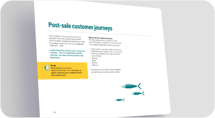 Post-sale customer journeys Since traditional demand generation focuses Many kinds of customer journeys primarily on net-new leads and opportunities, For new business, there is typically only one many marketing departments don’t receive credit goal of the journey: acquire the account. Post-sale, for campaign responses from existing leads and many goals emerge, each with unique journeys: customers — at all. • A Buying Center purchases additional products In ABM, Marketing and Sales don’t just land new • A different Buying Center buys the same products accounts — they also expand them together • Expansion (a Buying Center buys more of the over time. Post-sale customer journeys track same product) this process. • Renewal • Usage • Success Pro tip • Advocacy Marketing has the skill set to Multi-product companies will have a separate market to customers. Consider assigning journey for each product or solution as well. upsell / cross-sell pipeline responsibility to the marketing team. 125