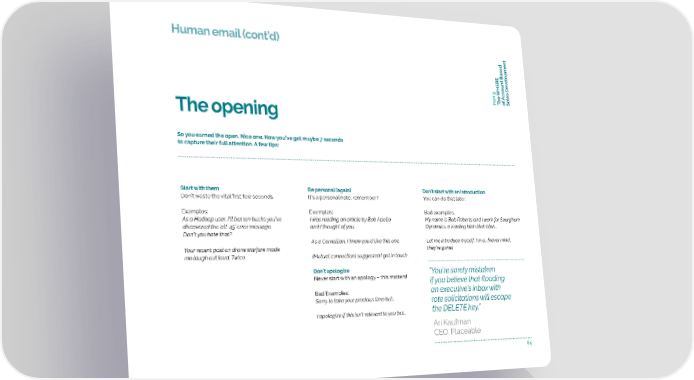 Human email (cont’d) t Based t elopmen v oun c c art 9 A f P The WHERE oSales De The opening So you earned the open. Nice one. Now you’ve got maybe 7 seconds to capture their full attention. A few tips: Start with them Be personal (again) Don’t start with an introduction Don’t waste the vital first few seconds. It’s a personal note, remember? You can do that later. Examples: Examples: Bad examples: As a Hadoop user, I’ll bet ten bucks you’ve I was reading an article by Bob Apollo My name is Bob Roberts and I work for Sourghum discovered the ‘alt-45’ error message. and I thought of you. Dynamics, a leading blah blah blah… Don’t you hate that? As a Cornellian, I knew you’d like this one. Let me introduce myself. I’m a… [never mind, Your recent post on drone warfare made they’re gone] me laugh out loud. Twice. [Mutual connection] suggested I get in touch. Don’t apologize “You’re sorely mistaken Never start with an apology – this matters! if you believe that flooding Bad Examples: an executive’s inbox with Sorry to take your precious time but… rote solicitations will escape I apologize if this isn’t relevant to you but… the DELETE key.” Ari Kaufman CEO, Placeable 64