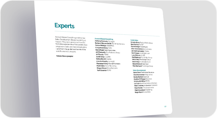 Experts Account Based Everything and the new Account Based Everything Inside Sales Sales Development discipline didn’t just Anthony Kennada Gainsight Anneke Seley Reality Works Group happen. They were generated from the Barbara Weaver Smith The Whale Hunters Bob Perkins AA-ISP front-line experiences of the world’s most Carlos Hidalgo ANNUITAS David Kreiger SalesRoads progressive sales and marketing leaders Craig Rosenberg TOPO Elisa Ciarametaro Exceed Sales - and from the guidance of some of the David Raab Raab Associates Jerimiah Lancaster VTS Inc. world’s smartest analysts. Jeff Pedowitz The Pedowitz Group Ken Krogue InsideSales.com Jeff Sands ITSMA Larry Reeves AA-ISP Follow these people! Justin Gray LeadMD Matt Bertuzzi The Bridge Group Kathy Macchi Inverta Sally Duby The Bridge Group Lincoln Murphy Gainsight Steve Hays InsideSalesTeam Maneeza Aminy Marvel Marketers Steve Richard ExecVision Matt Heinz Heinz Marketing Trish Bertuzzi The Bridge Group Megan Heuer SiriusDecisions Tom Scearce TOPO Sales Development Aaron Ross Predictable Revenue Chad Burmeister RingCentral Daniel Barber Datanyze Heather R Morgan Salesfolk Kristina McMillan TOPO Liz Cain OpenView Venture Partners Mark Cranney Andreessen Horowitz Mark Hunter The Sales Hunter Matt Amundson EverString Ralph Barsi ServiceNow 138