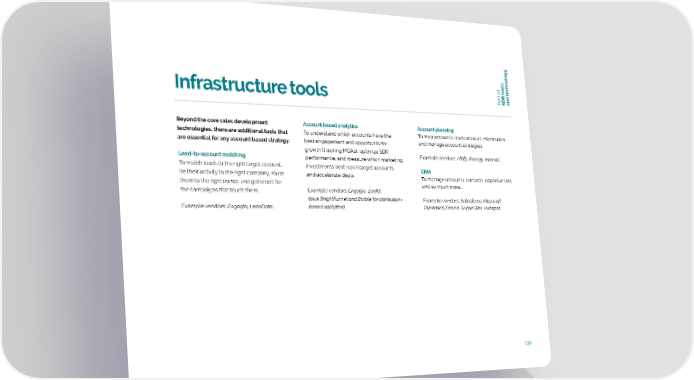ools echnology art 13 Infrastructure tools P SDR tand t Beyond the core sales development Account based analytics Account planning technologies, there are additional tools that To understand which accounts have the To map accounts, track account information, are essential for any account based strategy: best engagement and opportunity for and manage account strategies. growth (tracking MQAs), optimize SDR Lead-to-account matching performance, and measure which marketing Example vendors: Altify, Revegy, manual… To match leads to the right target account, investments best reach target accounts CRM tie their activity to the right company, route and accelerate deals. To manage accounts, contacts, opportunities, them to the right owner, and get credit for and so much more… the campaigns that touch them. Example vendors: Engagio, ZenIQ… (plus BrightFunnel and Bizible for attribution- Example vendors: Salesforce, Microsoft Example vendors: Engagio, LeanData… based analytics) Dynamics, Oracle, SugarCRM, Hubspot… 130