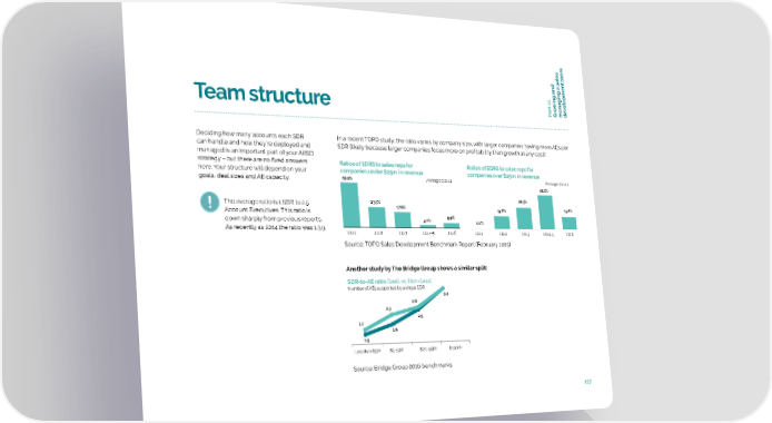 eam t t wing and elopmen art 11o v Team structure P Gr managing a sales de Deciding how many accounts each SDR In a recent TOPO study, the ratio varies by company size, with larger companies having more AEs per can handle and how they’re deployed and SDR (likely because larger companies focus more on profitability than growth at any cost): managed is an important part of your ABSD strategy – but there are no fixed answers Ratios of SDRS to sales reps for Ratios of SDRS to sales reps for here. Your structure will depend on your companies under $25m in revenue companies over $25m in revenue goals, deal sizes and AE capacity. 50.0% Average: 1 to 2.1 Average: 1 to 4.4 42.1% 23.5% 26.3% The average ratio is 1 SDR to 2.5 17.6% Account Executives. This ratio is 15.8% 15.8% down sharply from previous reports. 3.0% 5.9% 0.0% As recently as 2014 the ratio was 1:3.9. 1 to 1 1 to 2 1 to 3 1 to 4-5 1 to 6 1 to 1 1 to 2 1 to 3 1 to 4-5 1 to 6 Source: TOPO Sales Development Benchmark Report (February 2015) Another study by The Bridge Group shows a similar split: SDR-to-AE ratio (SaaS vs. Non-Saas) Number of AEs supported by a single SDR 3.4 2.6 2.3 2.5 1.7 1.9 1.5 Less than $5M $5-19M $20-99M $100M+ Source: Bridge Group 2016 benchmarks 117