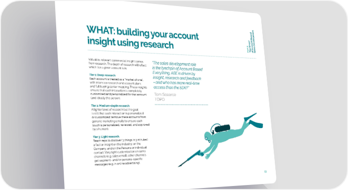 t Based t elopmen WHAT: building your account T v oun c c art 8 A f insight using research P The WHAoSales De Valuable, relevant commercial insight comes “The sales development role from research. The depth of research will reflect is the lynchpin of Account Based which tier a given account is in. Everything. ABE is driven by Tier 1: Deep research insight, research and feedback Each account is treated as a “market of one”, - and who has more real-time with intensive research and account plans and full buying center mapping. These insights access than the SDR?” ensure that each interaction is completely customized and personalized for that account Tom Scearce (and ideally the person). TOPO Tier 2: Medium-depth research A lighter level of research but the goal is still that each interaction is personalized or customized (remove these accounts from generic marketing emails to ensure each touch is personalized, reviewed, and approved by a human). Tier 3: Light research Teach reps to discover ‘3 things in 3 minutes’: a fact or insight on the Industry; on the Company; and on the Persona or individual contact. Very light customization on some channels (e.g. sales email); other channels get segment- and/or persona-specific messages (e.g. in online advertising). 53