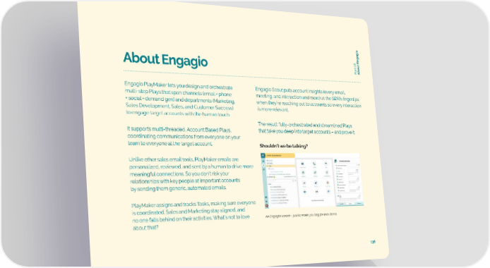 ngagio art 16 About Engagio P About E Engagio PlayMaker lets you design and orchestrate Engagio Scout puts account insights (every email, multi-step Plays that span channels (email + phone meeting, and interaction and more) at the SDR’s fingertips + social + demand gen) and departments (Marketing, when they’re reaching out to accounts so every interaction Sales Development, Sales, and Customer Success) is more relevant. to engage target accounts with the human touch. The result: fully-orchestrated and streamlined Plays It supports multi-threaded, Account Based Plays, that take you deep into target accounts – and prove it. coordinating communications from everyone on your team to everyone at the target account. Shouldn’t we be talking? Unlike other sales email tools, PlayMaker emails are personalized, reviewed, and sent by a human to drive more meaningful connections. So you don’t risk your relationships with key people at important accounts by sending them generic, automated emails. PlayMaker assigns and tracks Tasks, making sure everyone is coordinated, Sales and Marketing stay aligned, and no one falls behind on their activities. What’s not to love An Engagio screen – just to make you beg for that demo. about that? 136136