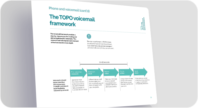 Phone and voicemail (cont’d) t Based t elopmen The TOPO voicemail v oun c c art 9 A f framework P The WHERE oSales De The voicemail framework provides a step-by-step process for creating and delivering impactful voicemails. This research note will explore each element The top 20 performers in TOPO’s Sales of the framework in more depth. Development Benchmark Report leave 29.5 voicemails a day and an average of 3.8 voicemails over 17.6 days per prospect. 22–25 Seconds Pre-voicemail Establish Deliver Call to Send research trust value action email Voicemails should Spend no more Differentiate yourself Tailor your message Always close with one Either send your email be no more than than three minutes by leveraging your to be as relevant simple call to action. prior to leaving a voicemail, 20 to 25 seconds to find two to three pre-voicemail research as possible to your Don’t tiptoe around or queue it up to send in length, and should key points that will to build rapport with prospect. Don’t just the topic; ask for what immediately afterward. be immediately help you establish your prospects. pitch your product. you want. followed by an email. trust and deliver value. 77