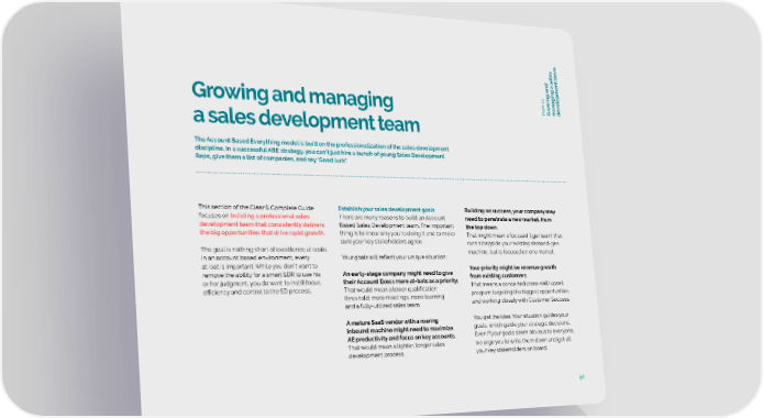 eam t t wing and elopmen art 11ov Growing and managing P Gr managing a sales de a sales development team The Account Based Everything model is built on the professionalization of the sales development discipline. In a successful ABE strategy, you can’t just hire a bunch of young Sales Development Reps, give them a list of companies, and say ‘Good luck’. This section of the Clear & Complete Guide Establish your sales development goals Building on success, your company may focuses on building a professional sales There are many reasons to build an Account need to penetrate a new market, from development team that consistently delivers Based Sales Development team. The important the top down. the big opportunities that drive rapid growth. thing is to know why you’re doing it and to make That might mean a focused ‘tiger team’ that sure your key stakeholders agree. runs alongside your existing demand-gen The goal is nothing short of excellence at scale. machine, but is focused on one market. In an account based environment, every Your goals will reflect your unique situation: at-bat is important. While you don’t want to Your priority might be revenue growth remove the ability for a smart SDR to use his An early-stage company might need to give from existing customers. or her judgment, you do want to instill focus, their Account Execs more at-bats as a priority. That means a concerted cross-sell/upsell efficiency and control to the SD process. That would mean a lower qualification program targeting the biggest opportunities threshold: more meetings, more learning and a fully-utilized sales team. and working closely with Customer Success. A mature SaaS vendor with a roaring You get the idea. Your situation guides your inbound machine might need to maximize goals, which guide your strategic decisions. AE productivity and focus on key accounts. Even if your goals seem obvious to everyone, That would mean a tighter, longer sales we urge you to write them down and get all development process. your key stakeholders on board. 9696