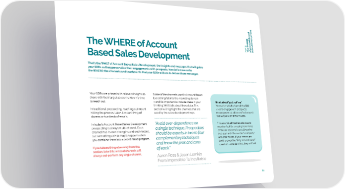 t Based t elopmen v oun c c art 9 A f The WHERE of Account P The WHERE oSales De Based Sales Development That’s the WHAT of Account Based Sales Development: the insights and messages that will guide your SDRs as they personalize their engagements with prospects. Now let’s move on to the WHERE: the channels and touchpoints that your SDRs will use to deliver those messages. Your SDRs are primed with relevant insights to Some of the channels used in Account Based share with their target accounts. Now it’s time Everything fall into the marketing domain to reach out. – and it’s important to include these in your It’s all about ‘you’, not ‘me’. thinking. We’ll talk about those later. This No matter which channel the SDR In traditional prospecting, reaching out meant section will highlight the channels that are uses to engage with prospects, hitting the phones. Later, it meant firing off used by the sales development reps. messages must all be crafted around dozens or hundreds of emails. the recipient and their needs. In today’s Account Based Sales Development, “Avoid over-dependence on This sounds almost too obvious to prospecting is always multi-channel. Each a single technique. Prospectors mention but it’s amazing how many channel has its own strengths and weaknesses, should be experts in two to four emails or voicemails we all receive but something akin to magic happens when that start with the sender’s company you combine them into a coordinated program. complementary techniques and their needs. If your messages and know the pros and cons don’t answer the ‘Why should I care?’ If you take nothing else away from this of each.” question – and do it first, they will fail. section, take this: a mix of channels will always out-perform any single channel. Aaron Ross & Jason Lemkin From Impossible To Inevitable 60