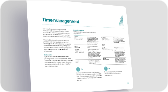 eam t t wing and elopmen art 11o v Time management P Gr managing a sales de Like everything else in successful ABSD A sample schedule teams, the daily schedule of the SDR is never TOPO offers this daily schedule with notes left to chance. Time management is reported for guidance: as a primary cause of reps failing to meet their targets, so a tightly defined schedule is critical. 8 - 9:30am Queue up prospects the 1 - 2:30pm In your final block of dedicated Follow-up responses/ previous day to begin calling Double touches prospecting time, you must immediate outreach immediately in the morning. (15 DTs = 30 touches) complete your daily activity The schedule should be based on the daily Follow up on any email goals. Don;t take another break responses as well. Set a goal to until you have. goals and activities needed to achieve the accomplish before taking a monthly quota. To do this, blocking out specific break e.g. make 10 calls. 2:30pm Break times for specific activities is key. The goal is 9:30am Schedule breaks every 2-3 to carve out one activity at a time, giving it total Coffee break hours. 3 - 4pm Work with your manager to Meeting hour establish a rule with your focus, then moving on to the next activity 10 - 12pm Schedule dedicated blocks (I am available for meetings) organization that you will only to keep fresh. Double touches of prospecting time on your be available for internal (20 DTs = 40 touches) calendar that nobody is allowed meetings during a dedicated to interrupt. Stay productive by time that won’t distract you Do the math setting mini-goals for these from prospecting. Ideally this blocks. For example, you should occurs during none-ideal If you need 8 connected calls a day to hit complete 20 DTs in the double calling hours. your targets and each takes 5 minutes, allow touch block. 4 - 5pm Use your final hour of the day to 40 minutes a day for these calls. And if you need Next day prep set yourself up for success the to make 40 double-touches (email plus voice 12 - 1pm By lunch, you should have next. This may include list Lunch completed over 50% of your building, buyer research and mail) with each taking 6 minutes, that’s four daily activity goal. crafting new messaging. hours of DTs per day. Tip: Tip: Avoid ad-hoc meetings and other distractions End each day prepping for tomorrow until reps have made progress against their daily and set aside 30 min a day to learn goal, such as making 10 calls before a 9am coffee something new. break or only allowing meetings to be scheduled after 2pm. 115