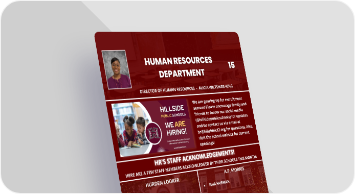 DIRECTOR OF HUMAN RESOURCES - ALICIA WILTSHIRE-KING We are gearing up for recruitment season! Please encourage family and friends to follow our social media (@hillsidepublicschools) for updates and/or contact us via email at [email protected] for questions. Also, visit the school website for current openings! HERE ARE A FEW STAFF MEMBERS ACKNOWLEDGED BY THEIR SCHOOLS THIS MONTH! A.P. MORRIS HURDEN LOOKER ISHA FAIRMAN JENNIFER PINHO ALISSA VALIANTE LINDSAY WILLIAMS HILLSIDE HIGH SCHOOL ROSALIND BARTHOLOMEW AND MATTHEW SMITH