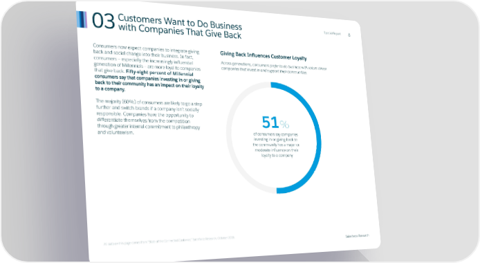 Special Report 03Customers Want to Do Business 8 with Companies That Give Back Consumers now expect companies to integrate giving Giving Back Influences Customer Loyalty back and social change into their business. In fact, consumers — especially the increasingly influential Across generations, consumers prefer to do business with values driven generation of Millennials — are more loyal to companies companies that invest in and support their communities. that give back. Fifty-eight percent of Millennial consumers say that companies investing in or giving back to their community has an impact on their loyalty to a company. The majority (60%) of consumers are likely to go a step further and switch brands if a company isn’t socially responsible. Companies have the opportunity to differentiate themselves from the competition 51% through greater internal commitment to philanthropy and volunteerism. of consumers say companies investing in or giving back to the community has a major or moderate influence on their loyalty to a company All data on this page comes from “State of the Connected Customer,” Salesforce Research, October 2016. Salesforce Research