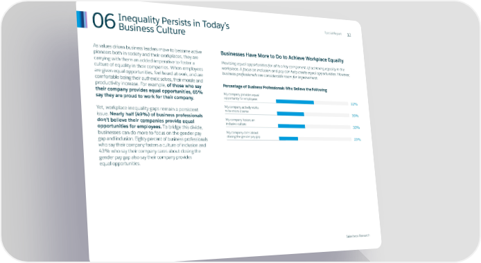 06Inequality Persists in Today’s Special RSpecial Reporeportt 1212 Business Culture As values driven business leaders move to become active Businesses Have More to Do to Achieve Workplace Equality pioneers both in society and their workplaces, they are carrying with them an added imperative to foster a Providing equal opportunities for all is a key component of achieving equality in the culture of equality in their companies. When employees workplace. A focus on inclusion and pay can help create equal opportunities. However, are given equal opportunities, feel heard at work, and are business professionals see considerable room for improvement. comfortable being their authentic selves, their morale and productivity increase. For example, of those who say Percentage of Business Professionals Who Believe the Following their company provides equal opportunities, 65% My company provides equal say they are proud to work for their company. opportunity for employees 51% My company actively works Yet, workplace inequality gaps remain a persistent to be more diverse 36% issue. Nearly half (49%) of business professionals My company fosters an don’t believe their companies provide equal inclusive culture 36% opportunities for employees. To bridge this divide, businesses can do more to focus on the gender pay My company cares about gap and inclusion. Eighty percent of business professionals closing the gender pay gap 25% who say their company fosters a culture of inclusion and 43% who say their company cares about closing the gender pay gap also say their company provides equal opportunities. Salesforce Research