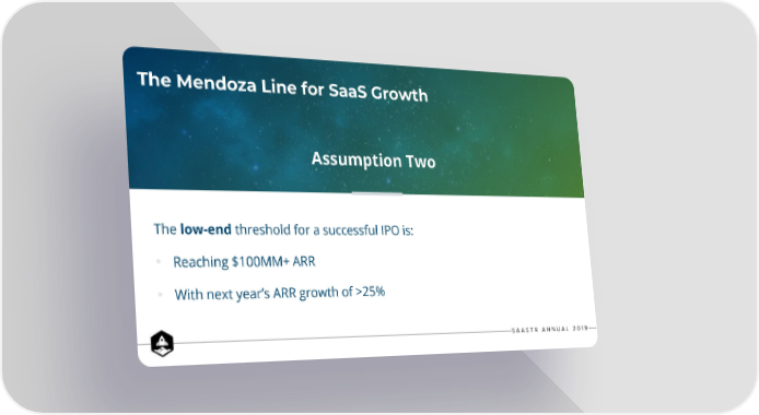The Mendoza Line for SaaS Growth Assumption Two The low-endthreshold for a successful IPO is: • Reaching $100MM+ ARR • With next year’s ARR growth of >25%