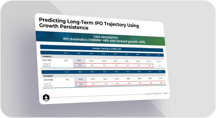 Predicting Long-Term IPO Trajectory Using Growth Persistence Core assumption: IPO threshold is $100MM+ ARR with forward growth >25% Example: Starting at $10MM ARR Yr-1 Yr0 Yr1 Yr2 Yr3 Yr4 Yr5 Yr6 Yr7 Company A ARR ($ MM) $5.0 $10.0 $18.2 $30.4 $47.2 $68.6 $94.0 $122.6 $153.1 Trailing Y/Y 100% 82% 67% 55% 45% 37% 30% 25% Growth (%) Yr-1 Yr0 Yr1 Yr2 Yr3 Yr4 Yr5 Yr6 Yr7 Company B ARR ($ MM) $5.6 $10.0 $16.5 $25.4 $36.6 $49.9 $64.6 $80.3 $96.3 Actual Y/Y 80% 65% 54% 44% 36% 30% 24% 20% Growth (%)