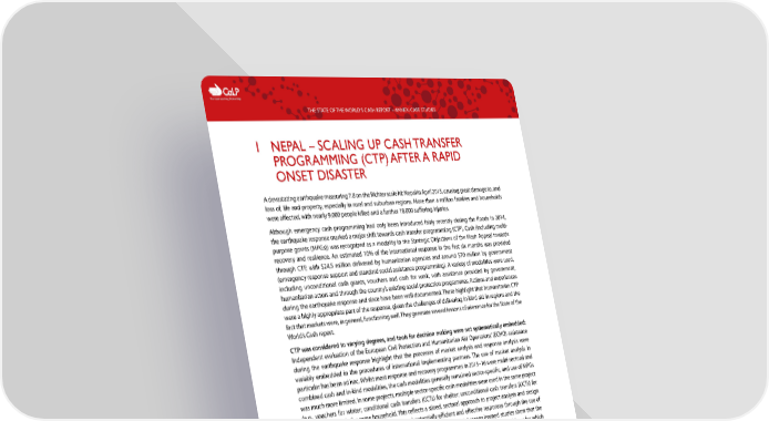 C The Cash Learning Partnership THE STATE OF THE WORLD’S CASH REPORT – ANNEX: CASE STUDIES 1 NEPAL – SCALING UP CASH TRANSFER PROGRAMMING (CTP) AFTER A RAPID ONSET DISASTER A devastating earthquake measuring 7.8 on the Richter scale hit Nepal in April 2015, causing great damage to, and loss of, life and property, especially in rural and suburban regions. More than a million families and households were affected, with nearly 9,000 people killed and a further 18,000 suffering injuries. Although emergency cash programming had only been introduced fairly recently during the floods in 2014, the earthquake response marked a major shift towards cash transfer programming (CTP). Cash (including multi- purpose grants (MPGs)) was recognized as a modality in the Strategic Objectives of the Flash Appeal towards recovery and resilience. An estimated 10% of the international response in the first six months was provided through CTP, with $24.5 million delivered by humanitarian agencies and around $70 million by government (emergency response support and standard social assistance programming). A variety of modalities were used, including unconditional cash grants, vouchers and cash for work, with assistance provided by government, humanitarian actors and through the country’s existing social protection programmes. Actions and experiences during the earthquake response and since have been well documented. These highlight that humanitarian CTP were a highly appropriate part of the response, given the challenges of delivering in-kind aid in regions and the fact that markets were, in general, functioning well. They generate several lessons of relevance for the State of the World’s Cash report. CTP was considered to varying degrees, and tools for decision making were not systematically embedded: Independent evaluation of the European Civil Protection and Humanitarian Aid Operations’ (ECHO) assistance during the earthquake response highlight that the processes of market analysis and response analysis were variably embedded in the procedures of international implementing partners. The use of market analysis in particular has been ad hoc. Whilst most response and recovery programmes in 2015–16 were multi-sectoral and combined cash and in-kind modalities, the cash modalities generally remained sector-specific, and use of MPGs was much more limited. In some projects, multiple sector-specific cash modalities were used in the same project (e.g., vouchers for winter; conditional cash transfers (CCTs) for shelter; unconditional cash transfers (UCTs) for food, etc.), to reach the same household. This reflects a siloed, sectoral approach to project analysis and design and a lack of consideration of more holistic and potentially efficient and effective responses through the use of MPGs despite these having been promoted in the Flash Appeal of 2015. Lessons learned studies show that the particular response often depended on what modality various agencies were most familiar with, or for which they had existing systems, or reflected donor preferences. Cash transfers were predominantly used for food, basic needs, livelihoods recovery and costs of labour for shelter reconstruction, whereas demand for shelter and hygiene materials were primarily met with in-kind assistance. Lack of capacity and preparedness for cash assistance constrains efficient and effective response: Neither partner agencies nor government were sufficiently prepared to exploit humanitarian cash responses to their maximum potential. National staff of international non-governmental organizations (INGOs) lacked technical capacity in CTP, as did government. This, along with a lack of policy coherence on CTP in emergencies, also created reluctance to implement cash transfers on the part of some local authorities, which in turn led to concerns and reluctance among implementing partners. Preparedness to rapidly scale up the use of cash transfers was also weak, with inadequate embedding of cash in contingency planning processes and mapping of pre-agreements with financial providers. The fact that cash was able to be used at the scale it was is testimony to the capacity and expertise that were ‘surged in’ by international agencies. Nevertheless, this lack of technical knowledge, experience, systems and processes on the ground led to confusion and some significant delays. The first international cash responses took place within two weeks of the earthquake but took two to three months to reach significant scale. This meant that large numbers of cash-based programmes for reconstruction provided the assistance after it was needed. Many people had already undertaken repairs due to the approaching monsoon, incurring debts in the process. 1