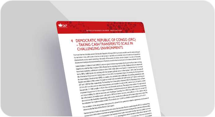 C The Cash Learning Partnership THE STATE OF THE WORLD’S CASH REPORT – ANNEX: CASE STUDIES 4 DEMOCRATIC REPUBLIC OF CONGO (DRC) – TAKING CASH TRANSFERS TO SCALE IN CHALLENGING ENVIRONMENTS For more than two decades, eastern Democratic Republic of Congo (DRC) has hosted one of the world’s most prolonged humanitarian crises, with scores of active armed groups in operation and multiple waves of violence and population displacements across several provinces. Hundreds of thousands of civilians remain trapped in a cycle of insecurity, displacement and poverty exacerbated by poor infrastructure and limited access to and/or the absence of basic services. United Nations Children’s Fund (UNICEF) and non-governmental organization (NGO) partners have been working together to assist families in eastern DRC affected by the ongoing cycle of conflict, displacement and return and have been exploring cash-based assistance since 2008. Initial pilots were based on voucher fairs for non-food items (NFIs), building on and working with the dynamic private sector in the region. In 2011, the first cycle of the Alternative Responses for Communities in Crisis (ARCC I) programme began, funded by the UK Department for International Development (DFID), to explore the potential and challenges of providing unrestricted and flexible modalities in this context through two small-scale unconditional cash transfer (UCT) pilots reaching just 237 and 1,000 families respectively. The learning from these pilots informed ARCC II. This programme ran from 2013 to 2015 and focused on taking humanitarian cash transfers to scale in DRC, delivering $2,781,660 to 23,480 households (117,400 people) in North Kivu and Orientale provinces. The programme worked through several implementing partners to test a range of modalities, transfer frequencies and delivery mechanisms, researching and documenting the relative successes and challenges. Learning from ARCC II provided ‘proof of concept’ for the effectiveness of multipurpose cash grants (MPGs) to foster recovery and resilience in this context and to demonstrate the feasibility of providing cash at scale, despite the challenges of the operating environment. This has informed the implementation of ARCC III, in which over 33,000 households received MPGs in 2016–2017. The evolution of the programme, from phase II to phase III, has generated valuable experiences and lessons of relevance for the State of the World’s Cash report: Harmonization of tools and approaches adds value, but requires effective coordination: In ARCC II, implementing partners were left to determine their own programming tools for decision making and for selection of the modality. In ARCC III, the processes of assessment and analysis were made more systematically. Agencies pooled common tools for market assessment and response analysis, adapting these where needed to make these relevant to the context. A harmonized market analysis was undertaken across all implementing partners. This was considered by UNICEF to be more accountable and to contribute to higher quality programming than in ARCC II, where partner experience and understanding led to big differences in the quality of analysis. There is a need for broader sharing and harmonization of tools and processes to encourage effective scaling up of CTP by other actors, in a context where awareness of ‘best practice’ tools for decision making was low. All tools are now being shared broadly with other cash actors through the CWG DRC website, hosted by CaLP. During ARCC III, ARCC implementing partners and other agencies have collaborated to jointly calculate a Minimum Expenditure Basket (MEB) across sectors, to inform design of both sector-specific programmes and ARCC’s MPG. The process was coordinated by the Goma-based cash working group (CWG), and a briefing note shared among members. This exercise has proved to be a useful process, allowing harmonization of MPG values across agencies and also harmonization of this value to take into account sector-specific assistance provided by other agencies. However, it was a lengthy process, taking between six and eight months to finalize. It required the engagement of several clusters, including those that were relatively new to cash transfer programming (CTP) (e.g., Water, Sanitation and Hygiene (WaSH), education, and health) and that required sensitization to the significance of cash- based responses, and an MEB, for their sector. Clusters then needed to prioritize MEB activities alongside other duties. There was little engagement from key players in the national response coordination architecture (such as the Inter-Cluster Coordination (ICC) team) which could have attached greater strategic importance to the exercise and accelerated cluster engagement. The process and the values have also not been validated by clusters or the ICC nationally – although it is being used in all provinces – which is necessary to support institutionalization. Taking cash to scale in difficult environments is feasible but requires an appetite for risk and learning by doing: ARCC III is designed specifically as a ‘cash first’ approach, at scale. It represents a significant shift in mindset from ARCC I, made 11