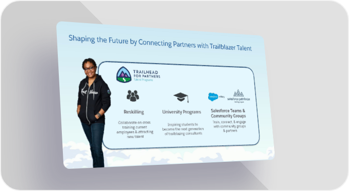 Shaping the Future by Connecting Partners with Trailblazer Talent Salesforce Teams & Reskilling University Programs Community Groups Collaborate on cross Train, connect, & engage Inspiring students to training current with community groups become the next generation employees & attracting & partners of trailblazing consultants new talent