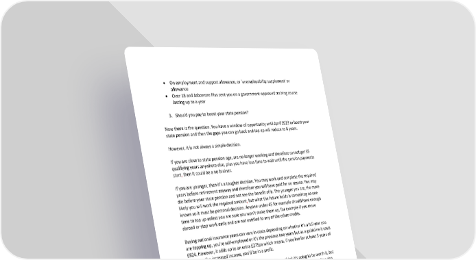 • On employment and support allowance, or 'unemployability supplement' or allowance • Over 18 and Jobcentre Plus sent you on a government-approved training course lasting up to a year 3. Should you pay to boost your state pension? Now there is the question. You have a window of opportunity until April 2023 to boost your state pension and then the gaps you can go back and top up will reduce to 6 years. However, it is not always a simple decision. If you are close to state pension age, are no longer working and therefore cannot get 35 qualifying years anywhere else, plus you have less time to wait until the pension payments start, then it could be a no brainer. If you are younger, then it’s a tougher decision. You may work and complete the required years before retirement anyway and therefore you will have paid for no reason. You may die before your state pension and not see the benefit of it. The younger you are, the more likely you will work the required amount, but what the future holds is something no one knows so it must be personal decision. Anyone under 45 for example should have enough time to top up unless you are sure you won’t make them up, for example if you move abroad or stop work early and are not entitled to any of the other credits. Buying national insurance years can vary in costs depending on whether it’s a full year you are topping up, you’re self-employed or it’s the previous two years but as a guideline it costs £824. However, it adds up to an extra £275pa which means, if you live for at least 3 years of receiving the increased income, you’d be in a profit. You could look at life expectancy projections to see if you think it’s going to be worth it, but it must be a personal decision and take your own health and future into account. You also must be aware that not everyone would get this full benefit, if you are a higher rate taxpayer there will be tax on the additional income elsewhere from the state pension, using more of your personal allowance and low earners might be better with pension credit. Make sure you do your research for your own circumstances before making a decision. This is an overview of the changes that are coming but you need to make sure to speak to the Pension services available to get an accurate picture for you personally. If you are not at state pension age, call the Future Pension Centre – 0800 731 0175 If you are already at state pension age, call the Pension Service – 0800 731 0469. If you have decided to buy extra years, which you can do in one go or over time then you will need an 18-digit reference number from HMRC which you can get over the phone. You then need to pay through your bank to HMRC or by cheque. This process can take a few weeks so don’t leave it until the last minute to action. Also, please note that if you are
