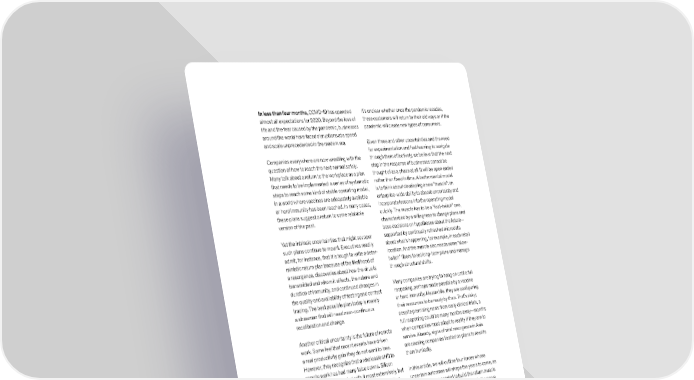 In less than four months, COVID-19 has upended it’s unclear whether once the pandemic recedes, almost all expectations for 2020. Beyond the loss of these customers will return to their old ways or if the life and the fear caused by the pandemic, businesses pandemic will create new types of consumers. around the world have faced disruptions at a speed and scale unprecedented in the modern era. Given these and other uncertainties and the need for experimentation and fast learning to navigate Companies everywhere are now wrestling with the through them effectively, we believe that the next question of how to reach the next normal safely. step in the response of businesses cannot be Many talk about a return to the workplace as a plan thought of as a phase at all. It will be open ended that needs to be implemented: a series of systematic rather than fixed in time. A better mental model steps to reach some kind of stable operating model, is to think about developing a new “muscle”: an in a world where vaccines are adequately available enterprise-wide ability to absorb uncertainty and or herd immunity has been reached. In many cases, incorporate lessons into the operating model these plans suggest a return to some relatable quickly. The muscle has to be a “fast-twitch” one, version of the past. characterized by a willingness to change plans and base decisions on hypotheses about the future— Yet the intrinsic uncertainties that might scupper supported by continually refreshed microdata such plans continue to mount. Executives readily about what’s happening, for example, in each retail admit, for instance, that it is tough to write a deter- location. And the muscle also needs some “slow- ministic return plan because of the likelihood of twitch” fibers to set long-term plans and manage a resurgence, discoveries about how the virus is through structural shifts. transmitted and whom it affects, the nature and duration of immunity, and continued changes in Many companies are trying to hang on until a full the quality and availability of testing and contact reopening, perhaps made possible by a vaccine tracing. The best possible plan today is merely or herd immunity. Meanwhile, they are configuring a strawman that will need near-continuous their resources to be ready by then. That’s risky; recalibration and change. despite promising news from early clinical trials, a full reopening could be many months away—months Another critical uncertainty is the future of remote when companies must adapt to reality if they are to work. Some feel that recent events have driven survive. Already, signs of viral resurgence in Asia a real productivity gain they do not want to lose. are causing companies fixated on plans to rewrite However, they recognize that a wholesale shift to them hurriedly. remote work has had many false dawns. Silicon Valley has experimented with it most extensively, but In this article, we will outline four forces whose after many attempts to implement telecommuting, uncertain outcomes will shape the years to come, as our research found that at 15 top firms, only 8 well as the steps needed to build the return muscle percent of the employees work remotely. These to grapple with these forces—especially the nerve companies do not want to try this again only to roll it center that powers the muscle. Once the center has back in a few years. been built and incorporated into a new operating model across the organization, muscular companies Customer behavior is a third unknown. Companies will be ready for a new era of competition. We won’t see the clear shift to digital among consumers and say that this work will make companies future proof; its inevitable impact: online shopping has expanded the pandemic has exposed the folly of that idea. But by up to 60 percent in some categories, and up to we argue that building a return muscle is the right 20 percent of online consumers in the United States discipline for these times. have switched at least some brands recently. But 6 What now? Ten actions to emerge stronger in the next normal September 2020