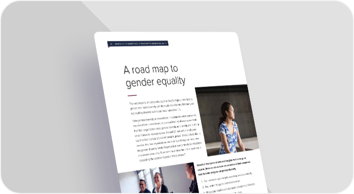32 | WOMEN IN THE WORKPLACE: A ROAD MAP TO GENDER EQUALITY A road map to gender equality The vast majority of companies say that they’re highly committed to gender and racial diversity, yet the evidence indicates that many are not treating diversity as the business imperative it is. Take gender diversity as an example. In contrast to what companies say about their commitment, only around half of all employees think that their organization sees gender diversity as a priority and is doing what it takes to make progress. Around 20 percent of employees say that their company’s commitment to gender diversity feels like lip service. And few organizations are making a strong business case for gender diversity: while 76 percent of companies have articulated a business case, only 13 percent have taken the critical next step of 17 calculating the positive impact on the business. Based on four years of data and insights from a range of experts, there are six actions we recommend that companies take to make progress on gender diversity. 1. Get the basics right—targets, reporting, and accountability 2. Ensure that hiring and promotions are fair 3. Make senior leaders and managers champions of diversity 4. Foster an inclusive and respectful culture 5. Make the “Only” experience rare Commitment to gender diversity is declining. In 2017, 90 6. Offer employees the flexibility to fit work into their lives percent of companies said they prioritized gender diversity, while just 84 percent say that this year. Employees are also less convinced of their company’s commitment. Last year, 56 percent said their organization was doing what it takes to improve gender diversity. This year that number has dropped to 45 percent. 17 For recent research making the business case for diversity, see “Why Diversity Matters,” McKinsey & Company, January 2015, https://www.mckinsey.com/business-functions/organization/our-insights/why-diversity-matters.