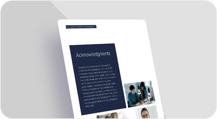 56 | WOMEN IN THE WORKPLACE: ACKNOWLEDGMENTS Acknowledgments LeanIn.Org and McKinsey & Company would like to thank the 279 companies and more than 64,000 employees who participated in this year’s study. By sharing their information and insights, they’ve given us new visibility into the state of women in the workplace and the steps companies can take to achieve gender equality. In particular, we appreciate the help of Women’s Foodservice Forum, the Healthcare Businesswomen’s Association, and Health Evolution in convening the food and healthcare industries. We would also like to thank Getty Images for providing the photography from the Lean In Collection used in this report.