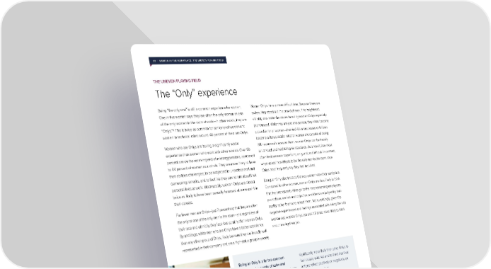 20 | WOMEN IN THE WORKPLACE: THE UNEVEN PLAYING FIELD THE UNEVEN PLAYING FIELD The “Only” experience Being “the only one” is still a common experience for women. Women Onlys have a more difficult time. Because there are One in five women says they are often the only woman or one so few, they stand out in a crowd of men. This heightened of the only women in the room at work—in other words, they are visibility can make the biases faced by women Onlys especially 12 “Onlys.” This is twice as common for senior-level women and pronounced. While they are just one person, they often become women in technical roles: around 40 percent of them are Onlys. a stand-in for all women—their individual successes or failures become a litmus test for what all women are capable of doing. Women who are Onlys are having a significantly worse With everyone’s eyes on them, women Onlys can be heavily experience than women who work with other women. Over 80 scrutinized and held to higher standards. As a result, they most percent are on the receiving end of microaggressions, compared often feel pressure to perform, on guard, and left out. In contrast, to 64 percent of women as a whole. They are more likely to have when asked how it feels to be the sole man in the room, men their abilities challenged, to be subjected to unprofessional and Onlys most frequently say they feel included. demeaning remarks, and to feel like they cannot talk about their personal lives at work. Most notably, women Onlys are almost Being an Only also impacts the way women view their workplace. twice as likely to have been sexually harassed at some point in Compared to other women, women Onlys are less likely to think their careers. that the best opportunities go to the most deserving employees, promotions are fair and objective, and ideas are judged by their Far fewer men are Onlys—just 7 percent say that they are often quality rather than who raised them. Not surprisingly, given the the only or one of the only men in the room—and regardless of negative experiences and feelings associated with being the odd their race and ethnicity, they face less scrutiny than women Onlys. woman out, women Onlys are also 1.5 times more likely to think By and large, white men who are Onlys have a better experience about leaving their job. than any other group of Onlys, likely because they are broadly well represented in their company and are a high-status group in society. Being an Only is a far too common significantly more likely than other Onlys to experience for people of color and feel closely watched and to think that their gay people. They face more extreme biases actions reflect positively or negatively on and have a more negative experience than other people like them. people like them who are not Onlys. Seventy-six percent of lesbian women Forty-five percent of women of color and 37 and 70 percent of gay men are often the percent of men of color are often the only only or one of the only people of their or one of the only people of their race or sexual orientation in the room. When gay ethnicity in the room. When this is the case, people are Onlys, they are twice as likely women and men of color are more likely to as other groups of Onlys to say they can’t feel excluded and scrutinized—and this is talk about themselves or their life outside especially pronounced for women of color of work. And like other Onlys, they also who are Onlys. In particular, Black women feel on guard, closely watched, and under are having a difficult experience. They are pressure to perform. 12 Historically, social scientists have used terms such as “numerical minorities” and “tokens” to describe similar dynamics. For the first study on this dynamic, see Rosabeth Moss Kanter, Men and Women of the Corporation (New York: Basic Books, 1977).