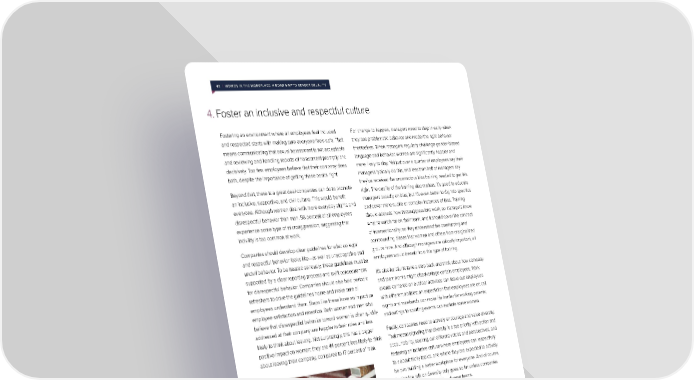 43 | WOMEN IN THE WORKPLACE: A ROAD MAP TO GENDER EQUALITY 4. Foster an inclusive and respectful culture Fostering an environment where all employees feel included For change to happen, managers need to step in early when and respected starts with making sure everyone feels safe. That they see problematic behavior and model the right behavior means communicating that sexual harassment is not acceptable themselves. When managers regularly challenge gender-biased and reviewing and handling reports of harassment promptly and language and behavior, women are significantly happier and decisively. Too few employees believe that their company does more likely to stay. Yet just over a quarter of employees say their both, despite the importance of getting these basics right. managers typically do this, and less than half of managers say they’ve received the unconscious bias training needed to get this Beyond that, there is a great deal companies can do to promote right. The quality of the training also matters: it’s good to educate an inclusive, supportive, and civil culture. This would benefit managers broadly on bias, but it’s even better to dig into specifics everyone. Although women deal with more everyday slights and and cover more subtle or complex instances of bias. Training disrespectful behavior than men, 58 percent of all employees should address how microaggressions work, so managers know experience some type of microaggression, suggesting that what to watch for on their team, and it should cover the concept incivility is too common at work. of intersectionality, so they understand the overlapping and Companies should develop clear guidelines for what collegial compounding biases that women and others from marginalized and respectful behavior looks like—as well as unacceptable and groups face. And although managers are critically important, all uncivil behavior. To be treated seriously, these guidelines must be employees would benefit from this type of training. supported by a clear reporting process and swift consequences It’s also helpful to take a step back and think about how company for disrespectful behavior. Companies should also hold periodic and team norms might disadvantage certain employees. Work refreshers to drive the guidelines home and make sure all events centered on outdoor activities can leave out employees employees understand them. Steps like these have an impact on with different abilities; an expectation that employees are on call employee satisfaction and retention. Both women and men who nights and weekends can make life harder for working parents; believe that disrespectful behavior toward women is often quickly and outings to sporting events can exclude some women. addressed at their company are happier in their roles and less likely to think about leaving. Not surprisingly, this has a bigger Finally, companies need to actively encourage and value diversity. positive impact on women: they are 44 percent less likely to think That means signaling that diversity is a top priority with action and about leaving their company, compared to 17 percent of men. accountability, seeking out different voices and perspectives, and fostering an inclusive culture where employees can respectfully talk about tricky topics, and where they are expected to actively help in building a better workplace for everyone. And of course, talking the talk on diversity only goes so far unless companies also walk the walk by building diverse teams.