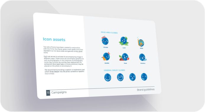 Brand guidelines Icon assets Two sets of icons have been created in conjunction with the 1% for the Planet globe motif: globe icons that represent our six issue areas and general smiley globe icons. Each set serves to activate its accompanying image in different ways. These icons can accompany graphics as well as photography. In the instances of photography, icons may function as a smiley face replacement for someone’s face (sparingly) or (more common) may be placed on the photo to accompany it. We recommend providing a caption or explanatory text which dives deeper into the photo contents or specific issue area(s). Campaigns 15 Climat e Land Wa ter Food Pollution Wildlif e ISSUE AREA GLOBES GENERAL SMILEY GLOBES