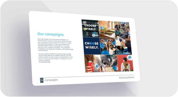 Brand guidelines br ew Campaigns 14 Our campaigns Each year as part of our annual ad campaign, our network gains access to world-class creative that they can customize and use to tell their 1% stories. In these brand guidelines (pgs. 9, 14-16), we showcase some example creative that we provided to our network during our Be 1% Better campaign. The campaign’s messaging and assets are evergreen, and we encourage continued use! To view and download the full suite of assets, please visit the login area of our website. Here you can find further context as well as ideas and inspiration on how best to incorporate Be 1% Better messaging into your communications. (1% network only)