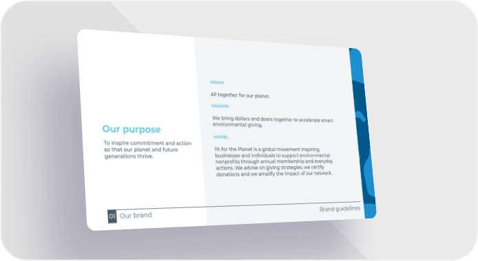 Brand guidelines Our purpose VISION All together for our planet. MISSION We bring dollars and doers together to accelerate smart environmental giving. MODEL 1% for the Planet is a global movement inspiring businesses and individuals to support environmental nonprofits through annual membership and everyday actions. We advise on giving strategies, we certify donations and we amplify the impact of our network. Our brand 01 To inspire commitment and action so that our planet and future generations thrive.