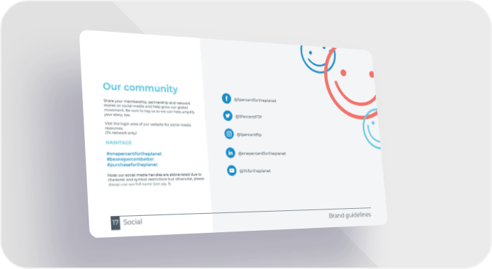 Brand guidelines Social 17 Our community Share your membership, partnership and network stories on social media and help grow our global movement. Be sure to tag us so we can help amplify your story, too. Visit the login area of our website for social media resources. (1% network only) HASHTAGS #onepercentfortheplanet #beonepercentbetter #purchasefortheplanet Note: our social media handles are abbreviated due to character and symbol restrictions but otherwise, please always use our full name (see pg. 3). @1percentfortheplanet @1PercentFTP @1percentftp @onepercentfortheplanet @1%fortheplanet