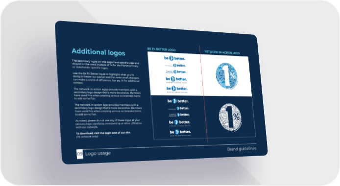 Brand guidelines Logo usage 09 Additional logos The secondary logos on this page have specific uses and should not be used in place of 1% for the Planet primary or stakeholder-specific logos. Use the Be 1% Better logos to highlight what you’re doing to better our planet and that even small changes can make a world of difference. See pg. 14 for additional context. The network-in-action logos provide members with a secondary logo design that’s more decorative. Members have used this when creating various co-branded items to add some flair. The network-in-action logo provides members with a secondary logo design that’s more decorative. Members have used this when creating various co-branded items to add some flair. As noted, please do not use any of these logos as your primary logo signifying membership or other affiliation with our network. To download, visit the login area of our site. (1% network only) BE 1% BETTER LOGO NETWORK-IN-ACTION LOGO [verb] [verb]