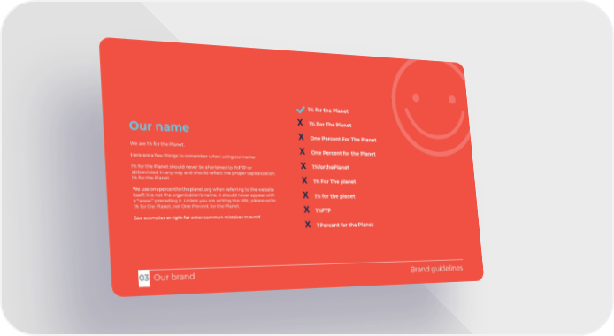 Brand guidelines We are 1% for the Planet. Here are a few things to remember when using our name: 1% for the Planet should never be shortened to 1%FTP or abbreviated in any way and should reflect the proper capitalization: 1% for the Planet We use onepercentfortheplanet.org when referring to the website itself; it is not the organization’s name. It should never appear with a “www.” preceding it. Unless you are writing the URL, please write 1% for the Planet, not One Percent for the Planet. See examples at right for other common mistakes to avoid. Our name 1% for the Planet 1% For The Planet One Percent For The Planet One Percent for the Planet 1%forthePlanet 1% For The planet 1% for the planet 1%FTP 1 Percent for the Planet Our brand 03 X X X X X X X X
