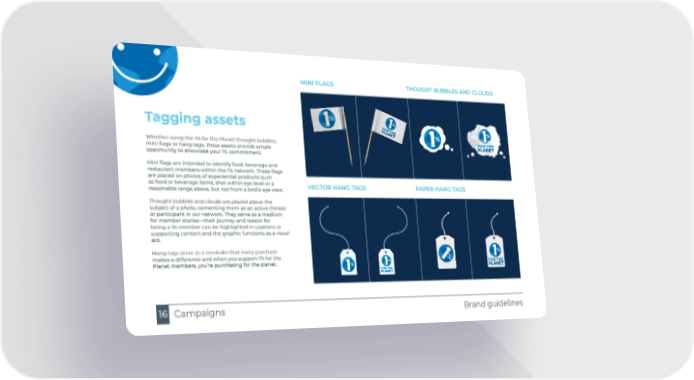Brand guidelines Campaigns 16 Tagging assets Whether using the 1% for the Planet thought bubbles, mini flags or hang tags, these assets provide ample opportunity to showcase your 1% commitment. Mini flags are intended to identify food, beverage and restaurant members within the 1% network. These flags are placed on photos of experiential products such as food or beverage items, shot within eye level or a reasonable range above, but not from a bird’s-eye view. Thought bubbles and clouds are placed above the subject of a photo, cementing them as an active thinker or participant in our network. They serve as a medium for member stories—their journey and reason for being a 1% member can be highlighted in captions or supporting content and the graphic functions as a visual aid. Hang tags serve as a reminder that every purchase makes a difference and when you support 1% for the Planet members, you’re purchasing for the planet. MINI FLAGS THOUGHT BUBBLES AND CLOUDS PAPER HANG TAGS VECTOR HANG TAGS