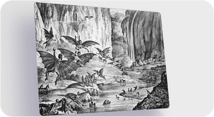 The articles described fantastic animals on the Moon, including bison, goats, unicorns, bipedal tail-less beavers and bat-like winged humanoids (" Vespertilio-homo") who built temples. There were trees, oceans and beaches. These discoveries were supposedly made with "an immense telescope of an entirely new principle."