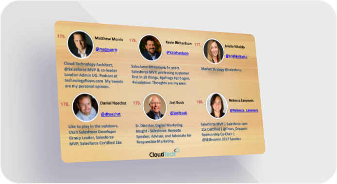 175. Matthew Morris 176. Kevin Richardson 177. Brielle Nikaido @matmorris @klrichardson @briellenikaido Cloud Technology Architect, Salesforce #dreamjob4+ years, Market Strategy @salesforce @Salesforce MVP & co-leader Salesforce MVP, professing customer London Admin UG. Podcast at first in all things. #gofrogs #godogers technologyflows.com My tweets #vivaletour. Thoughts are my own are my personal opinion. Daniel Hoechst 179. Joel Book 180. Rebecca Lammers 178. @dhoechst @joelbook @Rebecca_Lammers Like to play in the outdoors. Sr. Director, Digital Marketing Salesforce MVP | Salesforce.com Utah Salesforce Developer Insight - Salesforce. Keynote 11x Certified | @Texas_Dreamin Group Leader, Salesforce Speaker, Advisor, and Advocate for Sponsorship Co-Chair | MVP, Salesforce Certified 16x Responsible Marketing. @SEDreamin2017 Speaker