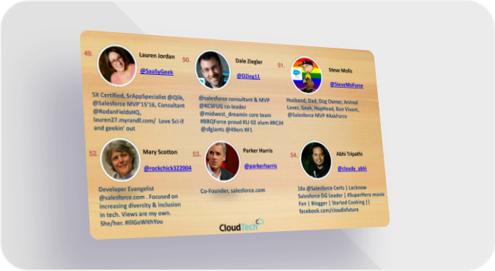 49. Lauren Jordan 50. Dale Ziegler 51. Steve Molis @SaaSyGeek @DZieg11 @SteveMoForce 5X Certified, SrAppSpecialist @Qlik, @salesforce consultant & MVP Husband, Dad, Dog Owner, Animal @Salesforce MVP'15'16, Consultant @KCSFUG co-leader Lover, Geek, HopHead, Bon Vivant, @RodanFieldsHQ, @midwest_dreamincore team @Salesforce MVP #AskForce lauren27.myrandf.com/ Love Sci-if #BBQForceproud KU 02 alum #RCJH and geekin' out @sfgiants@49ers #F1 52. Mary Scotton 53. Parker Harris 54. AbhiTripathi @rockchick322004 @parkerharris @cloudy_abhi Developer Evangelist Co-Founder, salesforce.com 16x @Salesforce Certs | Lucknow @salesforce.com . Focused on Salesforce DG Leader | #SuperHero movie increasing diversity & inclusion Fan | Blogger | Started Cooking || in tech. Views are my own. facebook.com/cloudisfuture She/her. #IllGoWithYou