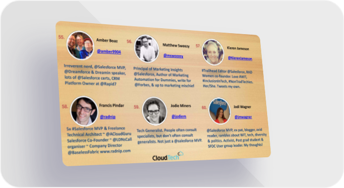 55. Amber Boaz 56. Matthew Sweezy 57. KierenJameson @amber9904 @msweezey @KierenJameson Irreverent nerd, @Salesforce MVP, Principal of Marketing Insights #Trailhead Editor @Salesforce, RAD @Dreamforce & Dreaminspeaker, @Salesforce, Author of Marketing Women co-founder. Love #WIT, lots of @Salesforce certs, CRM Automation for Dummies, write for #inclusionInTech, #NonTradTechies. Platform Owner at @Rapid7 @Forbes, & up to marketing mischief Her/She. Tweets my own. 58. Francis Pindar 59. Jodie Miners 60. Jodi Wagner @radnip @jodiem @jmwagner 5x #Salesforce MVP & Freelance Tech Generalist. People often consult @Salesforce MVP, ex pat, blogger, avid Technical Architect ~ @ACloudGuru specialists, but don't often consult reader, rambles about WiT, tech, diversity Salesforce Co-Founder ~ @LDNsCall generalists. Not just a @salesforce MVP. & politics. Activist, Post grad student & organiser~ Company Director SFDC User group leader. My thoughts! @BaselessFabricwww.radnip.com
